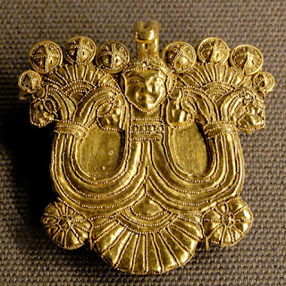 Gold pin with a Mistress of the Animals (potnia theron). Gold with granulation, Greek, ca. 630 BCE at The Louvre, courtesy of Wikimedia Commons contributor Marie-Lan Nguyen.
