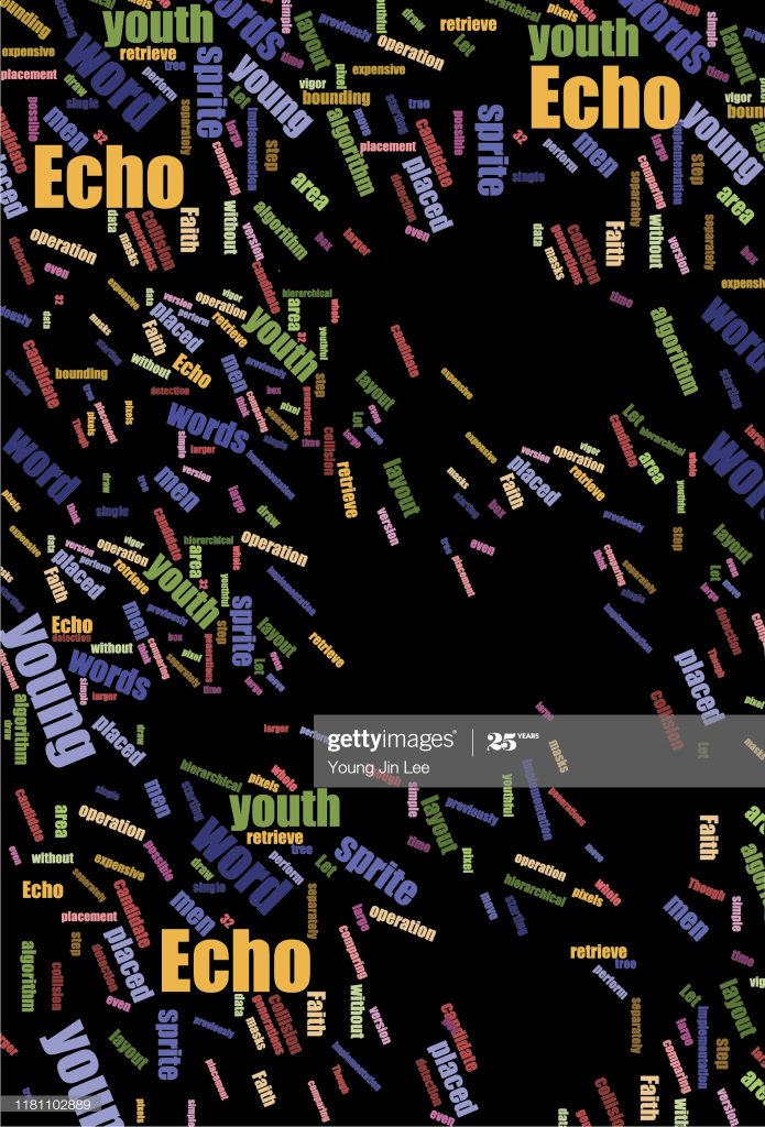 Word Cloud vector file with the echo generation motif. It consists of words such as Echo, Youth, Young, Faith, and Spirit.