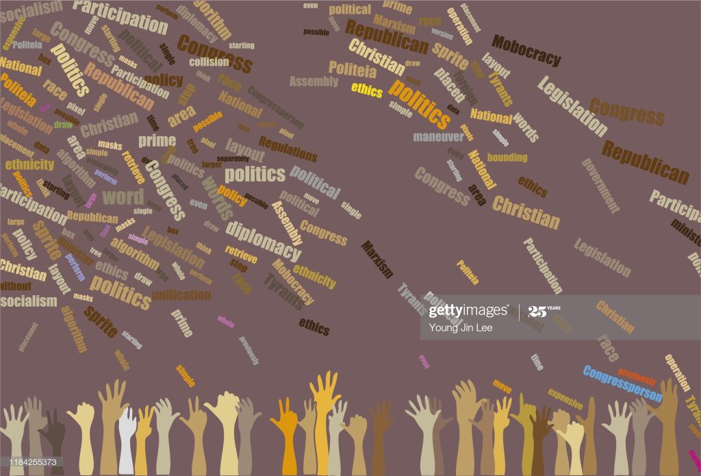 Word Cloud vector file with the Christian Politics motif. It consists of words such as Politeia (which means in Greek political thought, especially that of Plato and Aristotle), Christian, Assembly, Marxism, Socialism, Legislature, and Hand Raised.